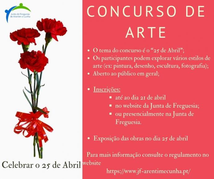 O Concurso de Arte "Celebrar o 25 de Abril" tem como objetivo promover e reconhecer talentos na área das artes visuais, proporcionando um momento para que artistas da nossa União de Freguesias partilhem a sua criatividade e expressão.Para poderem participar deve realizar a sua inscrição no seguinte link:https://forms.gle/WYh6C6iSsRtih4y7APara mais informações brevemente será disponibilizado o Regulamento do Concurso.